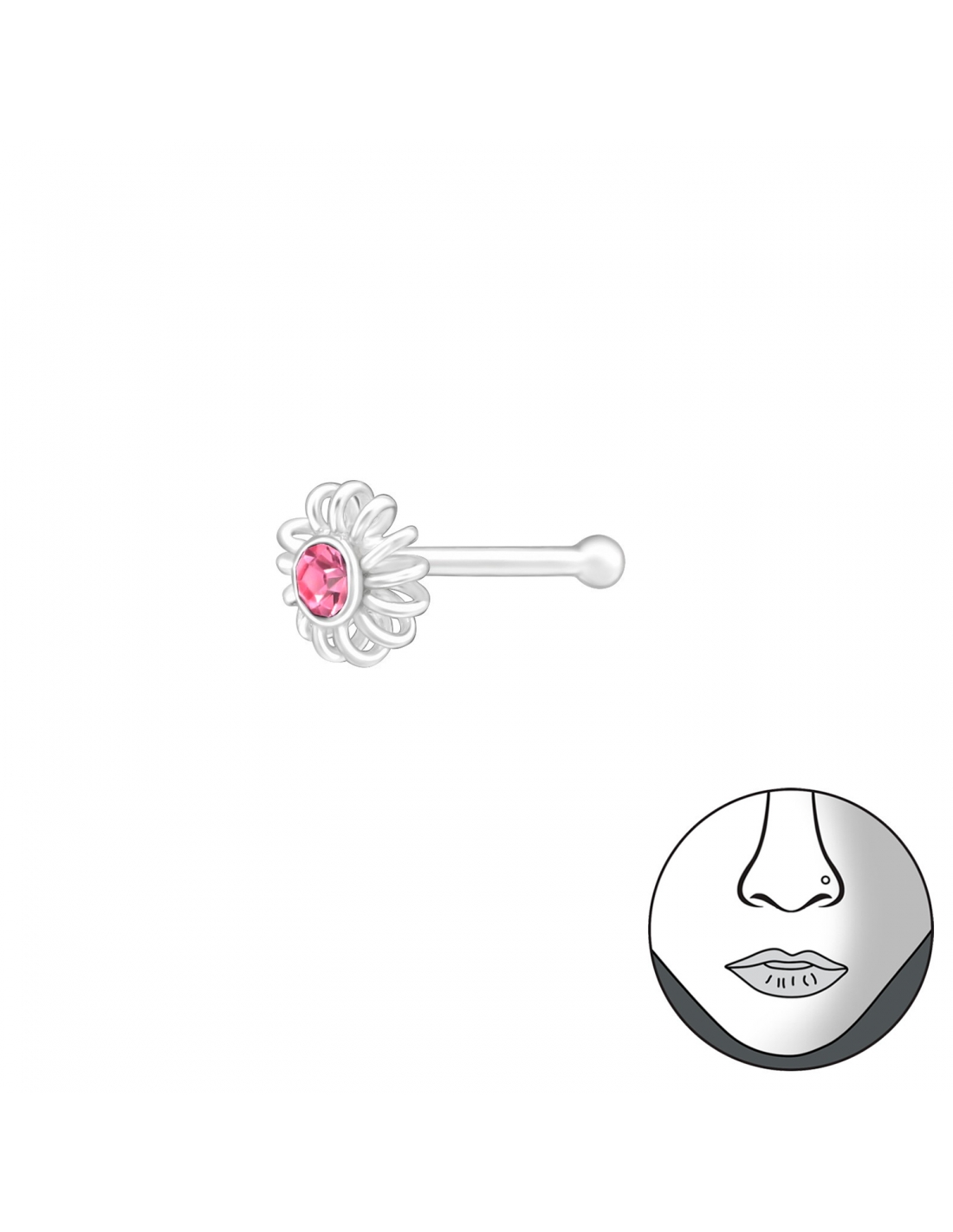 Aro de plata para nariz con flor y cristal rosado 1un